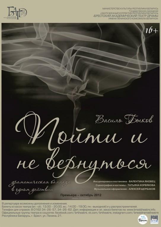 «Пойти и не вернуться» — драматическая баллада Василя Быкова в одном действии. Произведения Быкова пропитаны суровой правдой жизни. Спектакль о войне, фронте, силе воли и человеческом достоинстве. Главные герои Антон и Зося перенесут вас в другое время.