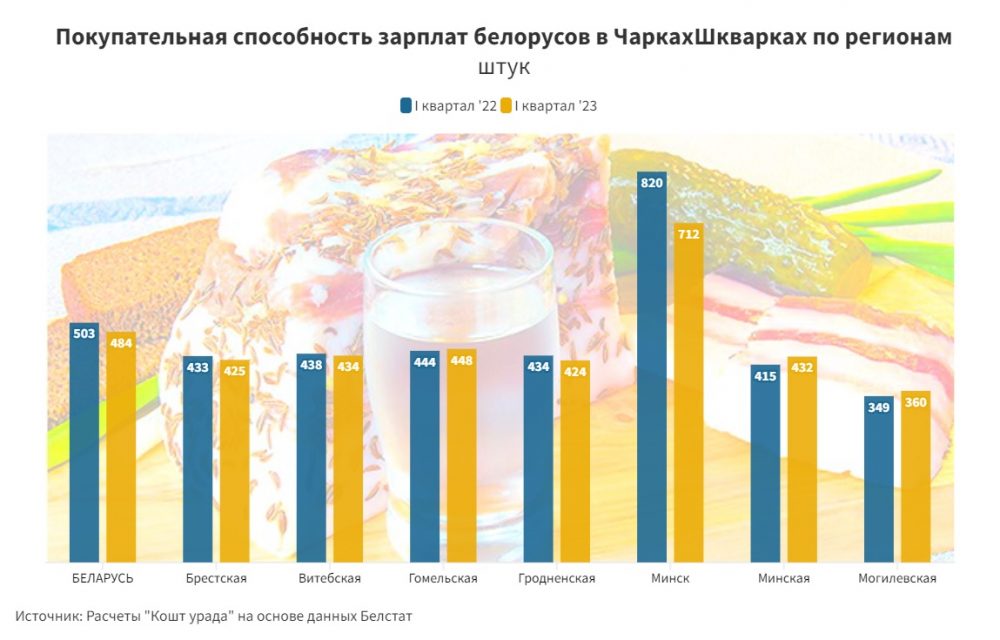 Эксперты проекта «Кошт урада» составили очередной индекс «чарки-шкварки» (ЧШ). Измеренные по ним зарплаты беларусов в первом квартале этого года упали до уровня 2021 года. А стоимость одной «чарки-шкварки» всего за один квартал этого года выросла на 6,9% и составила 3,57 рублей.