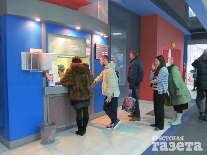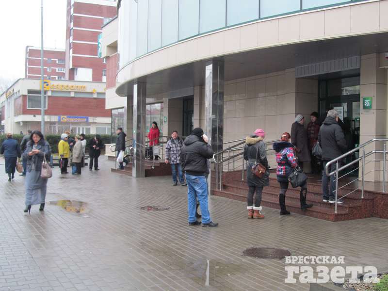 Единственным банком, где на вопрос «Есть ли валюта?» ответили положительно, был один из банков на бульваре Космонавтов. То, что там ситуация отличается от увиденного нами в других пунктах, заметно еще с улицы, куда вылез «хвост» очереди. Благо сегодня в Бресте тепло, хотя и немного сыро. Несравнимо больше людей внутри — не протолкнуться. Консультант объяснила, что валюта банком продается, но никто не гарантирует, что ее хватит на всех.