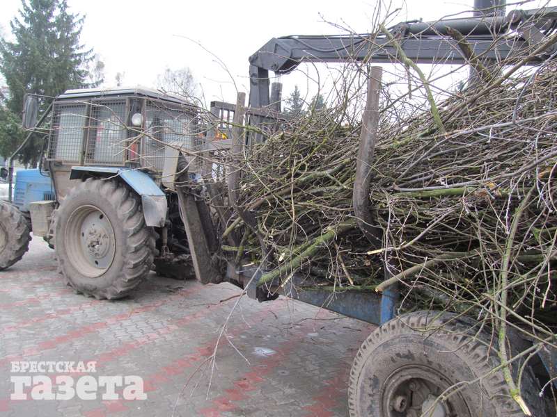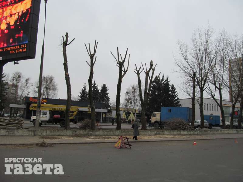 А на следующий день пришел черед и деревьев, растущих рядом с парковкой возле «Интуриста». На месте работ в 12.30 корреспондент «БГ» увидел, четыре свежеобрезанных дерева. Часть срезанных мелких веток уже была сложена в прицеп для перевозки леса с манипулятором, другие еще лежали возле деревьев — ждали своей очереди. Более толстые части ветвей были сложены возле дороги. Еще шесть деревьев растущих неподалеку оставались с нетронутыми кронами.