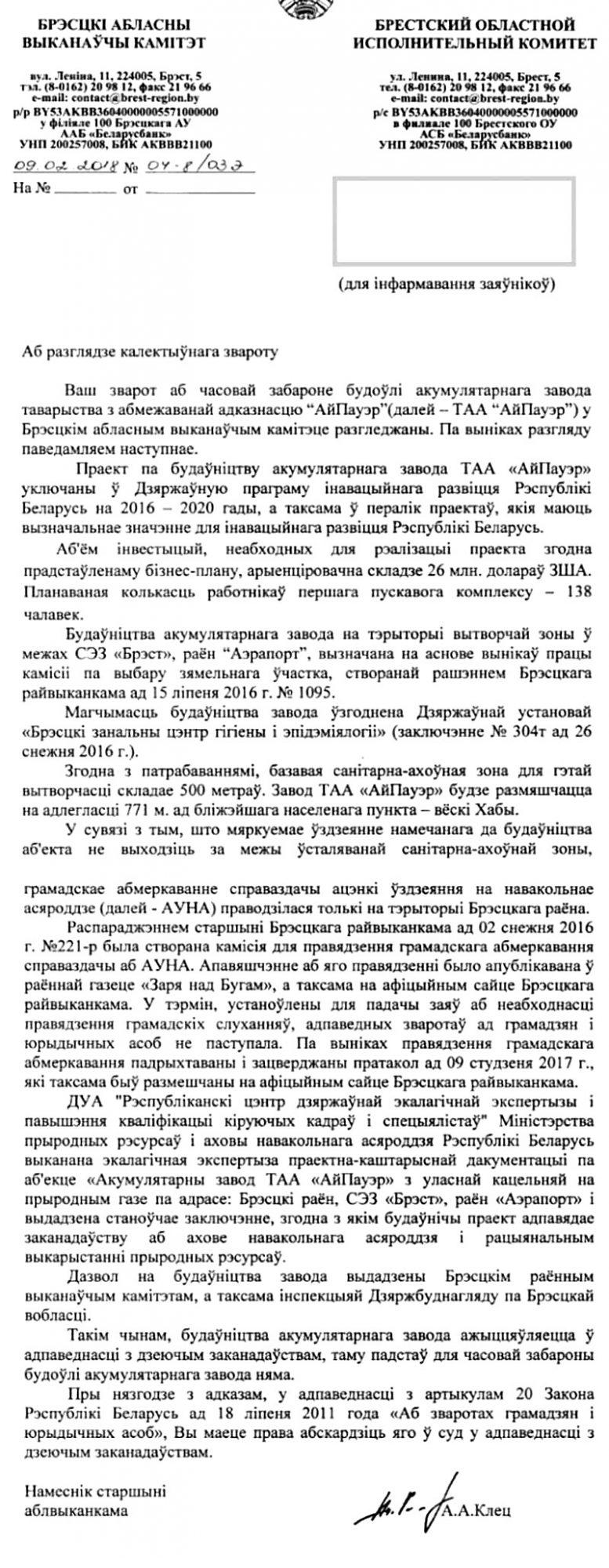 9 февраля инициаторы обращения получили ответ за подписью заместителя председателя облисполкома Андрея Клеца. Ссылаясь на ряд документов, в том числе разрешения и согласования с различными инстанциями, власти области делают вывод, что строительство завода «АйПауэр» ведется в соответствии с законодательством и оснований для временного запрета строительства нет.