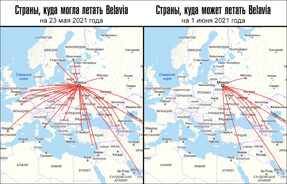 Белорусская авиакомпания «Белавиа» из-за инцидента с посадкой борта Ryanair в Минске потеряла 20 стран и российский Калининград, в которые совершала полеты. Об этом сообщает компания в своем официальном аккаунте в Instagram.