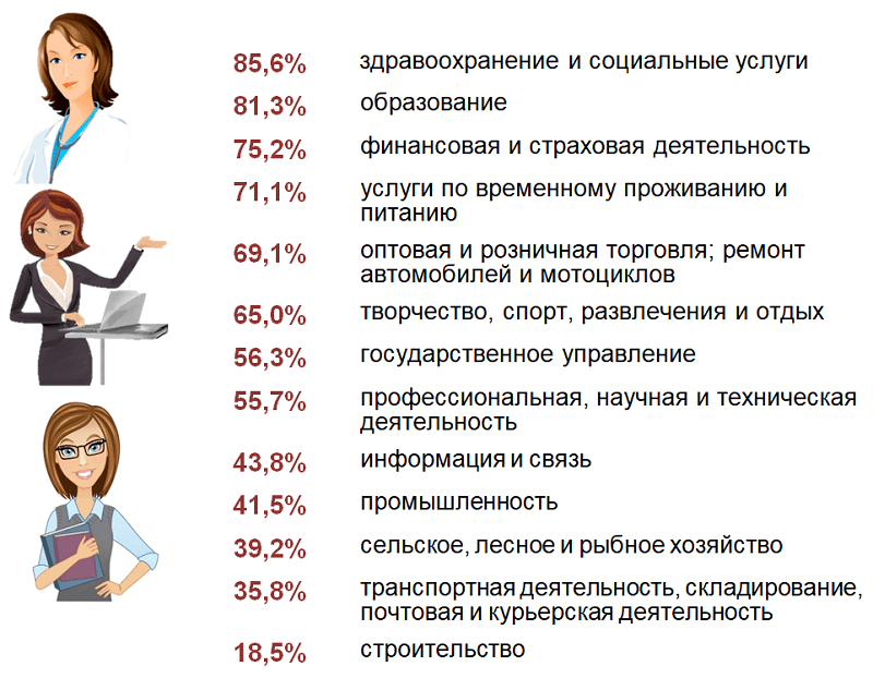 Традиционно женскими остаются здравоохранение и социальные услуги (85,6%) и образование (81,3%). Также довольно много женщин занято в финансовой и страховой деятельности (75,2%). В государственном управлении 56,3% составляют женщины. Самый маленький процент в строительстве – 18,5%.