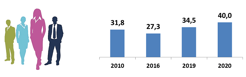 Образовательный уровень женщин выше, чем у мужчин. Среди занятых женщин 40,2% имеют высшее образование, 27,3% – среднее специальное.