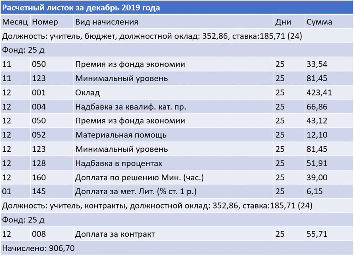 Расчетники работников образования подтверждают, что в январе они получили зарплаты значительно ниже, чем в ноябре и декабре прошлого года. К примеру, учитель высшей квалификационной категории с 32-летним педагогическим стажем суммы в ноябре за 25 дней получил 1 351,28 рубля, в декабре за 25 дней — 1 470,99 рубля, а в январе — 1 176,46 рубля. Правда, в январе на один день он отработал меньше. Разница в суммах с ноябрем составила 174,82 рубля, а с декабрем — 294,53 рубля.