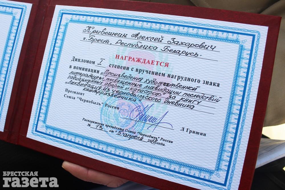 Книга «Ликвидация» нашла свою награду: в апреле 2018 года она была удостоена диплома первой степени на конкурсе общероссийского союза общественных объединений «Союз «Чернобыль» России» в номинации «Произведения художественной литературы, посвященные ликвидации последствий на Чернобыльской АЭС». Автор награжден нагрудным знаком «Лауреат конкурса в области литературы и искусства в номинации «Патриотизм и верность долгу». Алексей Захарович говорит, что такое признание для него ценнее любых денег.