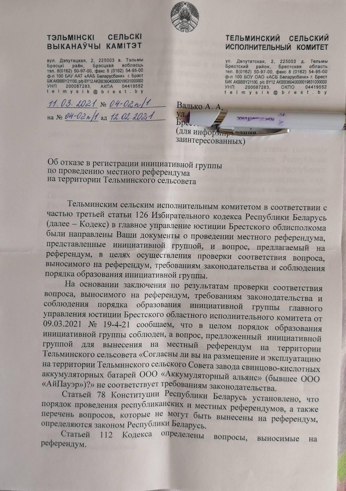 Инициативная группа по проведению местного референдума о судьбе аккумуляторного завода под Брестом получила отказ Тельминского сельского исполкома в регистрации инициативной группы.