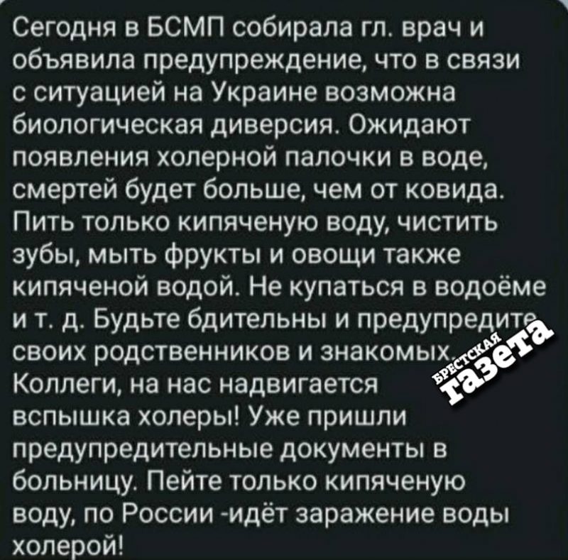 Во вторник читатели «Брестской газеты» прислали редакции скриншот сообщения, которое, по их словам, начало активно распространяться среди жителей Бреста. В тексте говорилось о якобы биологической диверсии — «холерной палочке в питьевой воде».