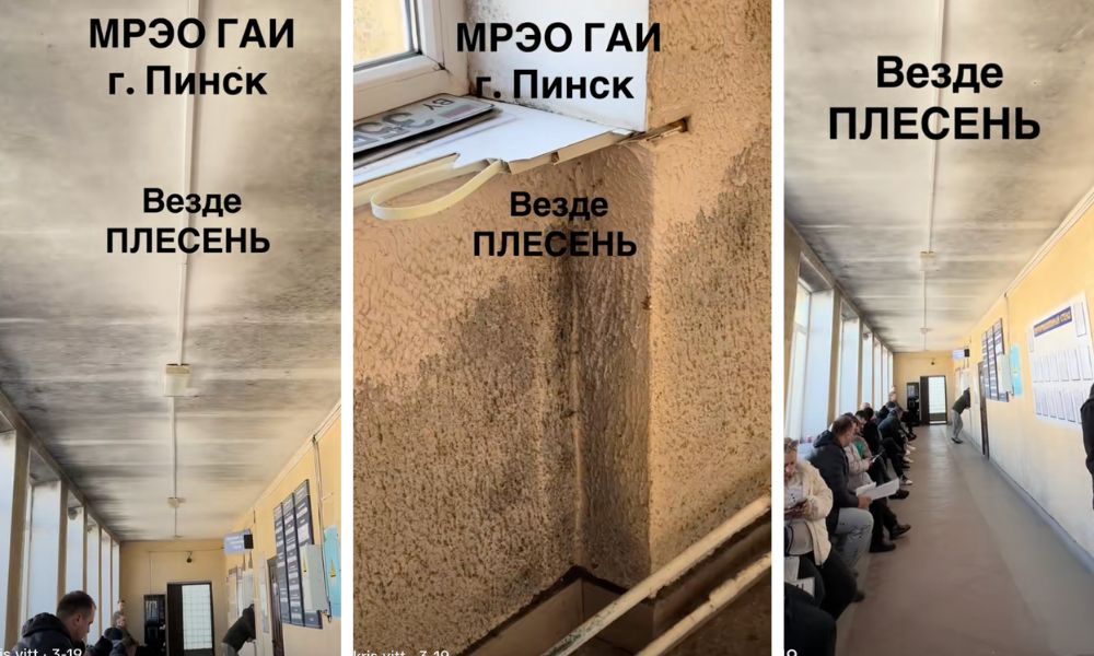 В ролике, опубликованном в TikTok, видно, что стены коридора в МРЭО ГАИ Пинска буквально покрыты грибком, а воздух в помещении тяжелый.