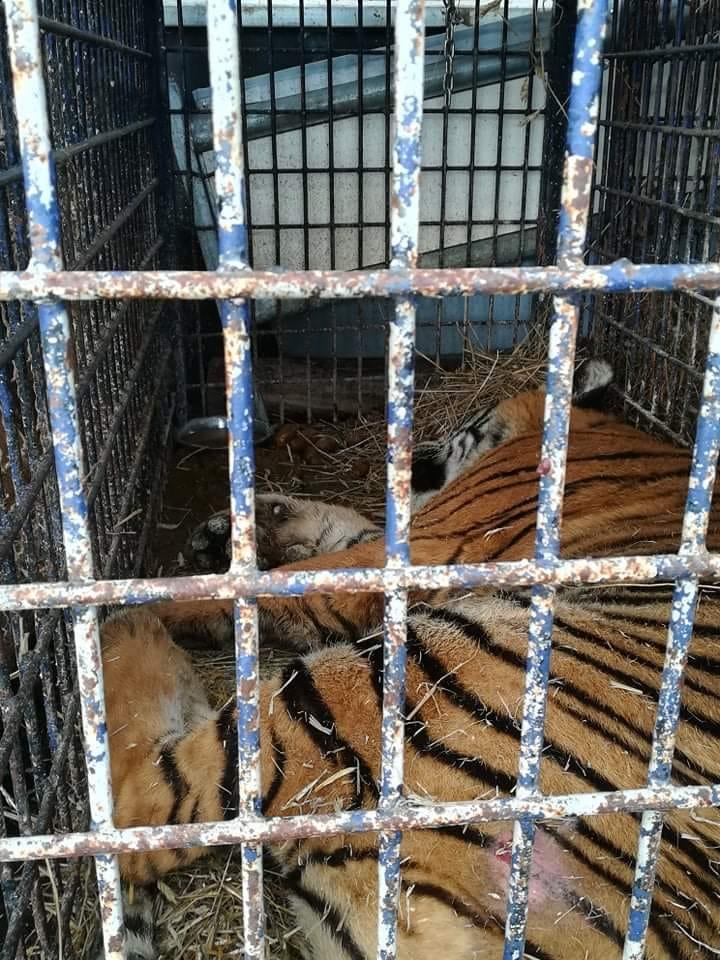 По словам сотрудников, в одном из ящиков, который разваливается, тигр сошел с ума от стресса и ведет себя агрессивно. Его клетка преграждала доступ к остальным. В других ящиках животные в очень плохом состоянии, но живые. В одном — никаких признаков жизни.