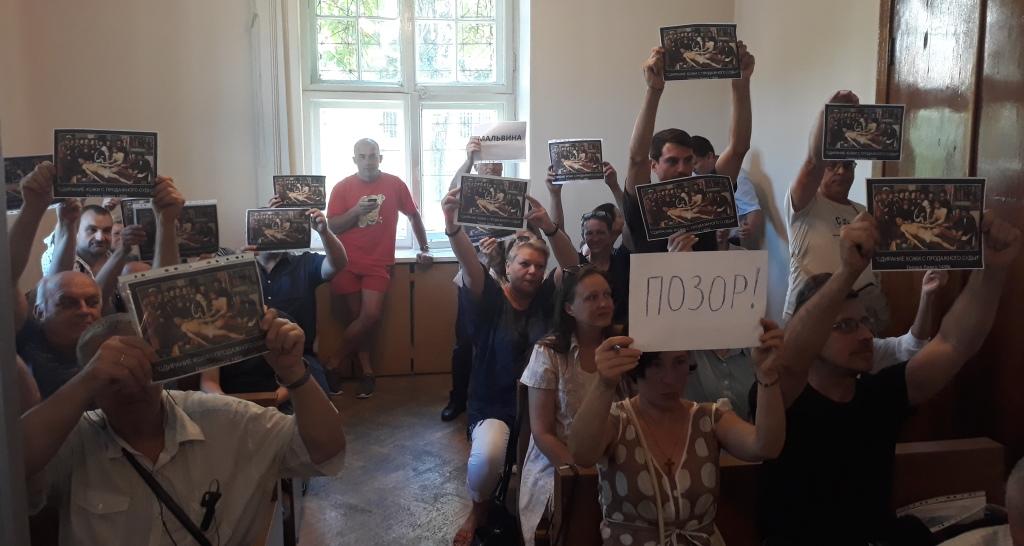 Александр Кабанов, Дмитрий Бекалюк и Олег Ермоленко в суде (слева направо)Во время рассмотрения административного дела Бекалюк ходатайствовал о вызове в суд свидетелей в лице сотрудников милиции, которые вели видеозапись задержания, а также об истребовании видеозаписей, сделанных ими, для объективного и всестороннего рассмотрения дела. Судья Святослав Калина отказал в удовлетворении ходатайства. Это возмутило присутствующих на заседании людей и после объявления перерыва они подняли вверх заранее подготовленные листы. Кроме того, участники флешмоба подали жалобы на имя председателя суда с просьбой провести проверку действий судьи Калины.