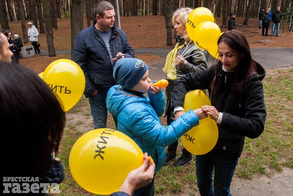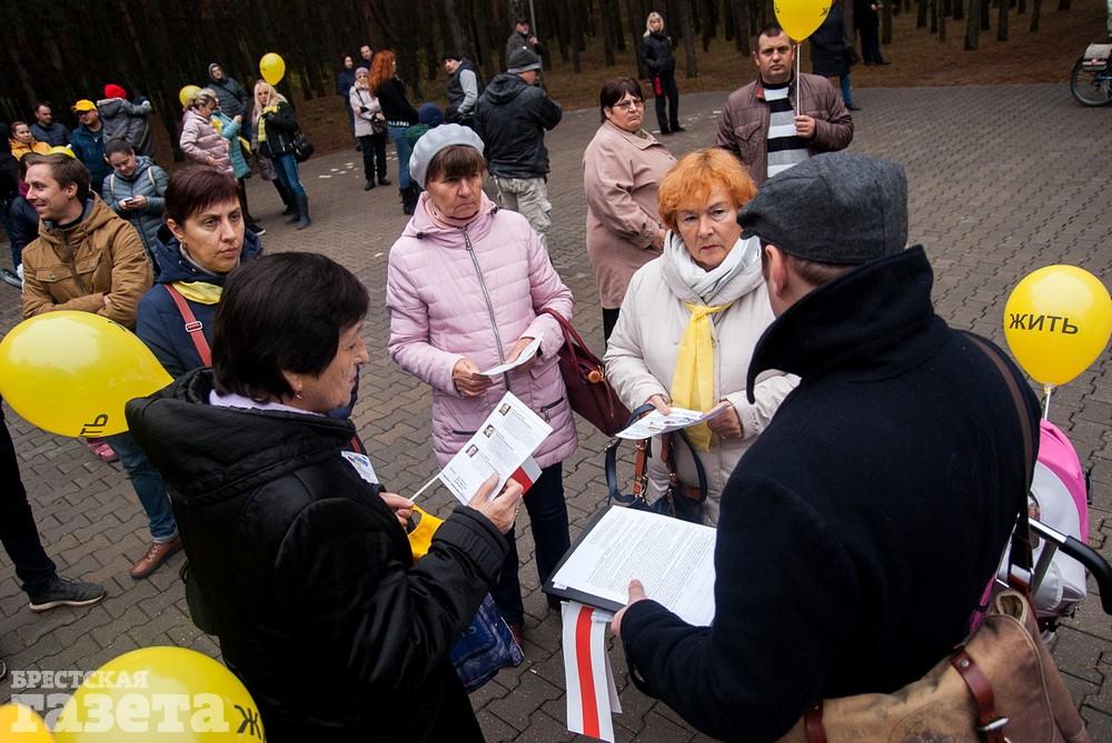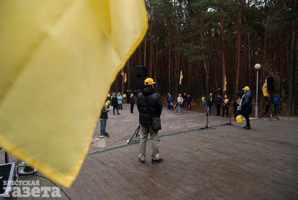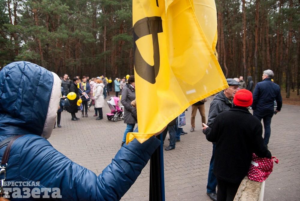 Собравшиеся держали бело-красно-белые флаги, флаги движения «За Свободу», желтые шары и желтые флаги со словом «Жить» как символом борьбы против аккумуляторного завода.