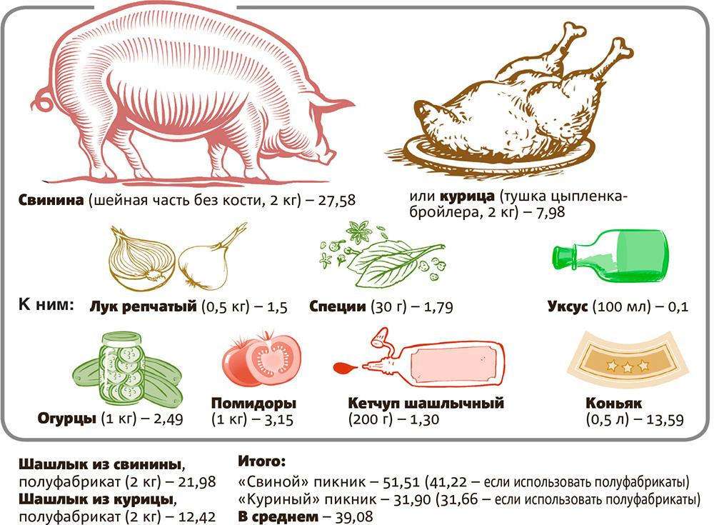 Для подсчетов мы, по традиции, взяли меню, состоящее из куриного или свиного шашлыка на выбор, кетчупа, овощей и коньяка (для аппетита!). Кстати, мы подсчитали стоимость не только полуфабриката мясного блюда, но и ингредиентов для его маринования в домашних условиях.
