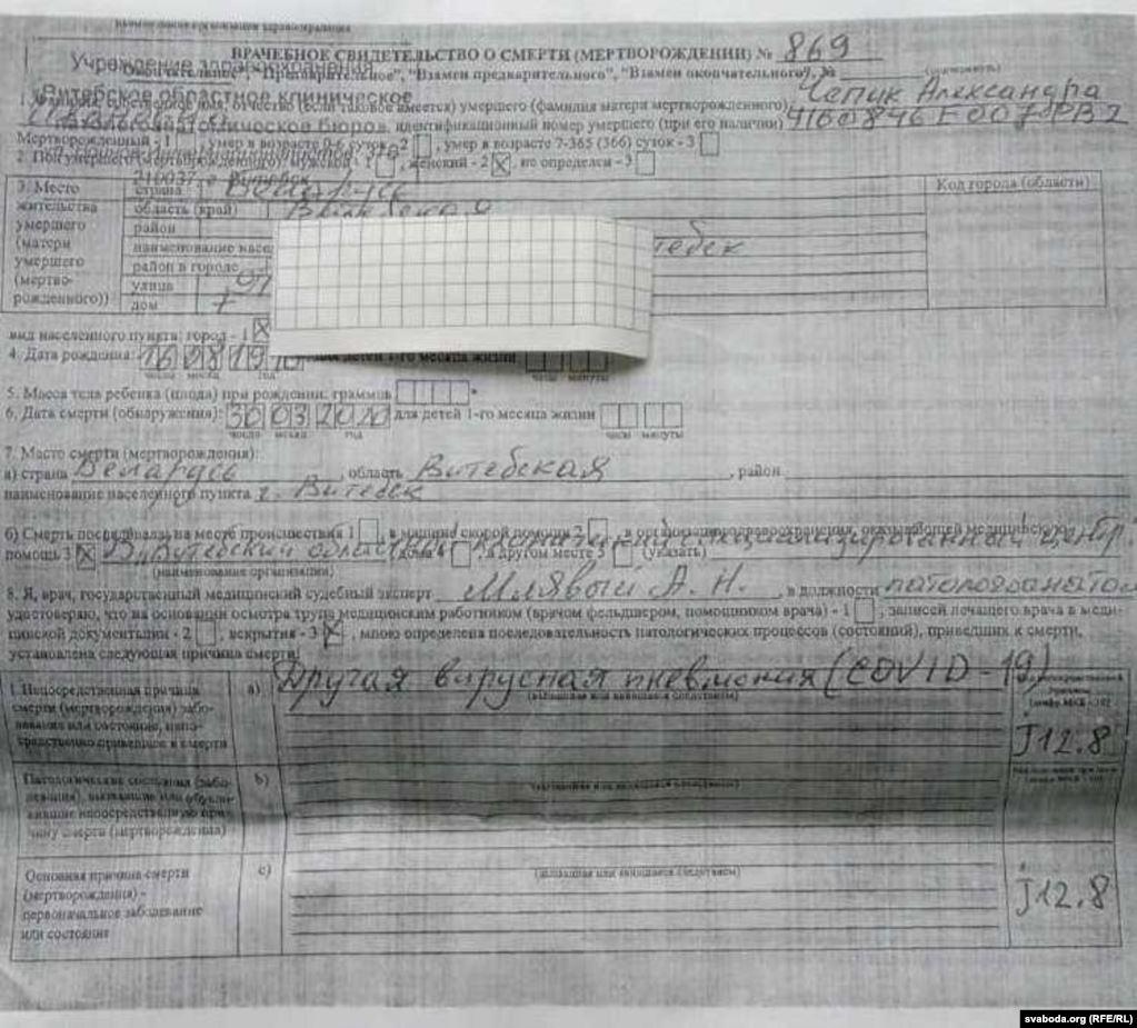 Жительница Витебска Александра Чепик умерла утром 30 марта в витебской больнице. В свидетельстве о смерти женщины написано «другая вирусная пневмония (COVID-19)». На похороны побоялись прийти даже близкие друзья, пишет «Радио Свобода».