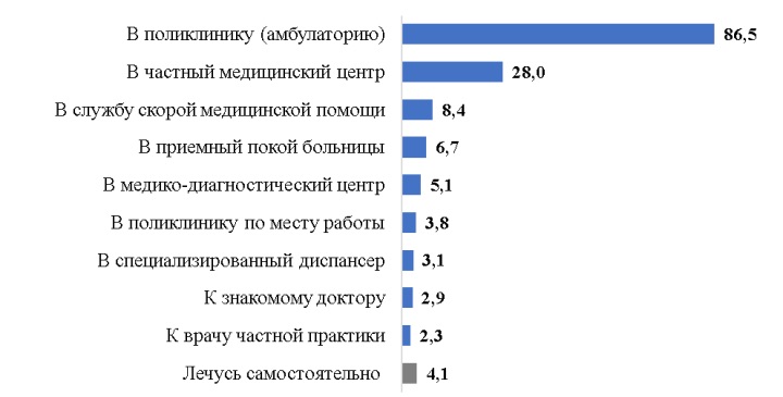 Респондентам предложили выбрать несколько вариантов, куда они обращаются за врачебной помощью.