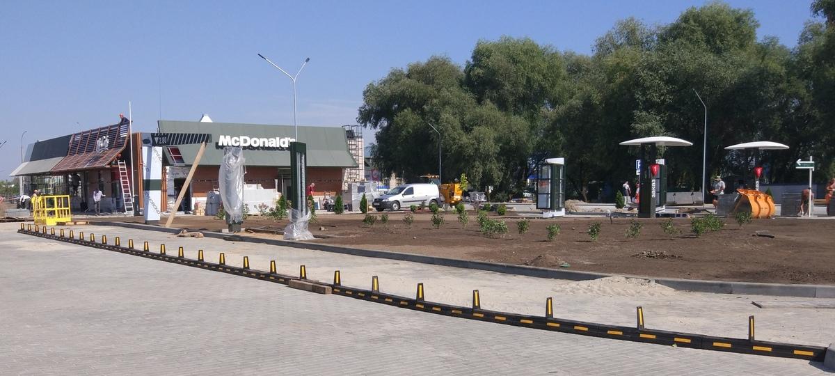 В пятницу вся территория стройплощадки была огорожена забором, а тротуарной плитки было уложено очень мало. Рабочие монтировали кровлю на здание, утепляли стены. На крыше будущего ресторана не было никаких вывесок с логотипом. На 23 августа стройплощадка выглядела так.