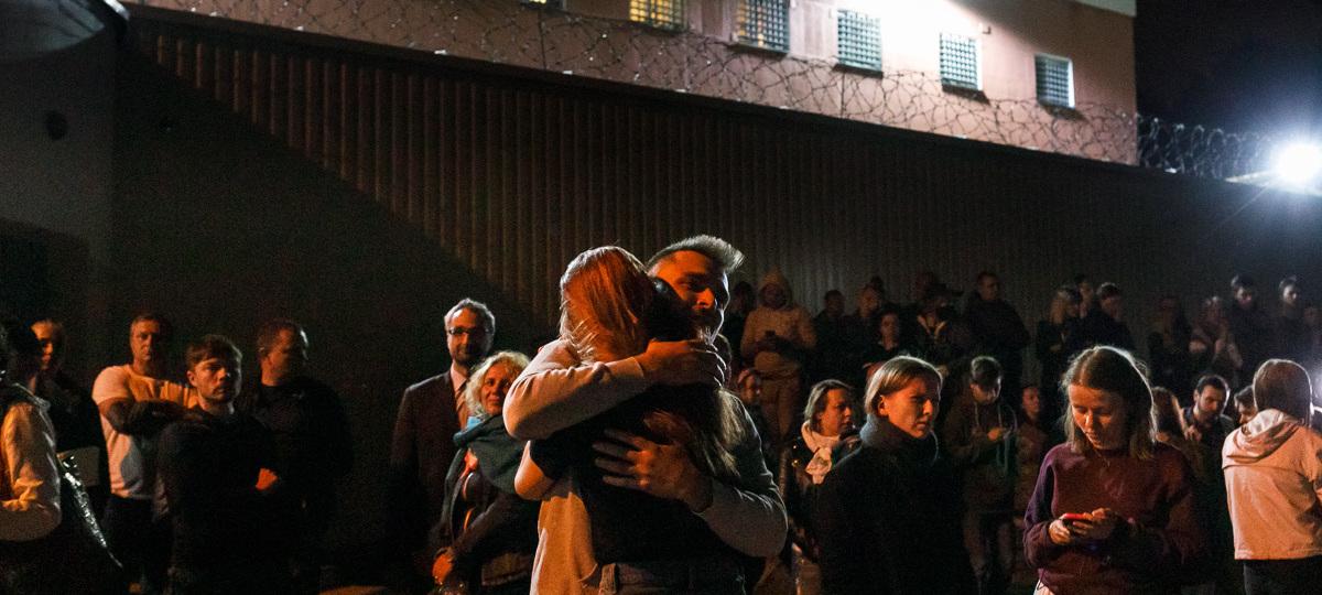 — Когда нас построили, чтобы вести на первый этаж, все завели руки за спину, нагнули головы и побежали друг за другом. Правда, на этот раз нам сказали, что мы можем идти нормально, «уже все в порядке». Мы спустились во двор, там нам приказали выстроиться в две колонны и по очереди заходить кабинет, чтобы подписать какие-то бумаги.