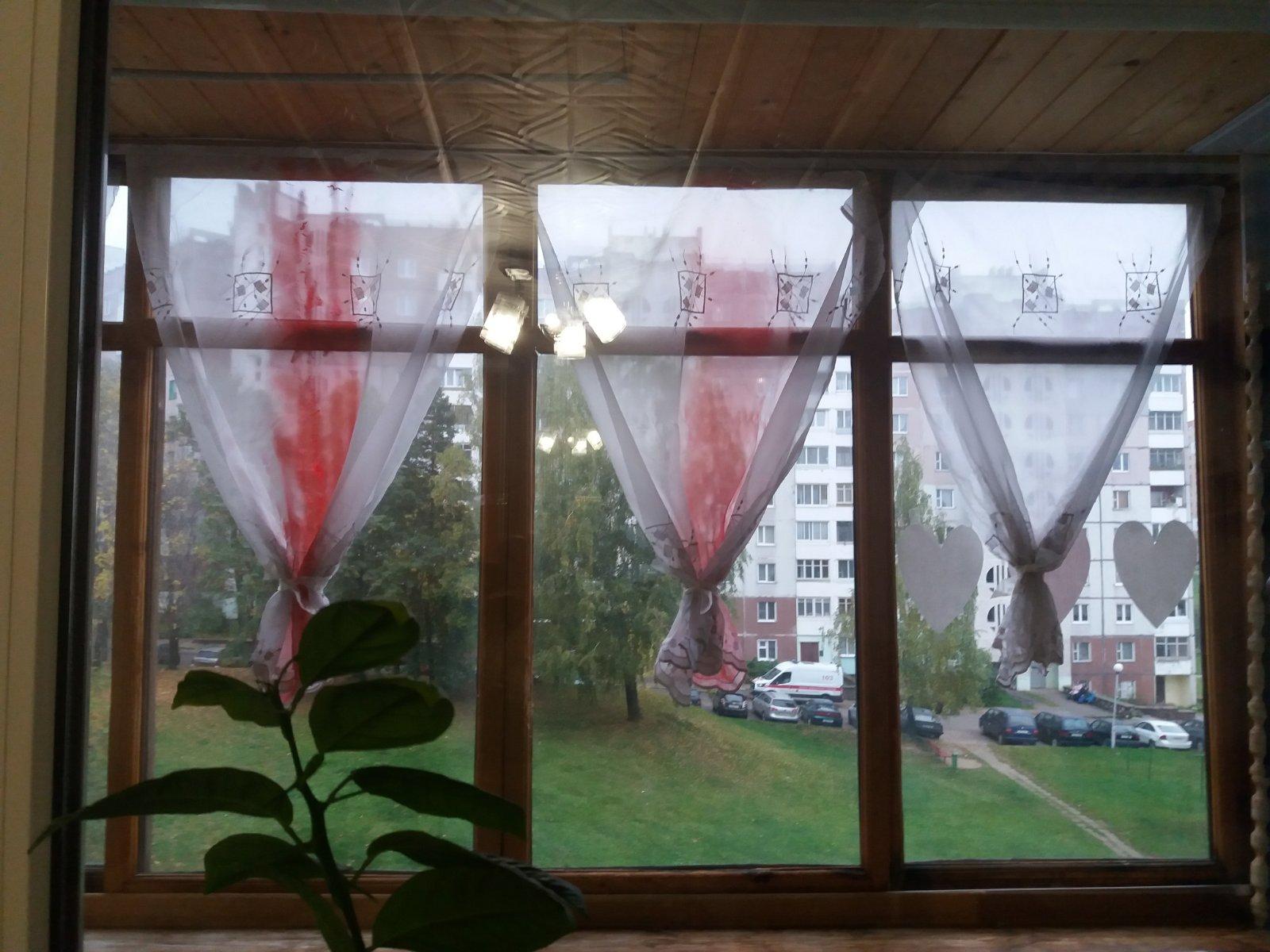 Сотрудники спросили, что случилось. Отец Ольги, по ее словам, сказал прямо: «Вот, моя семья здесь вывесила флаги». Хотя, подчеркивает женщина, это нельзя назвать флагами: обычные белые занавески с нарисованными от руки красными полосочками.