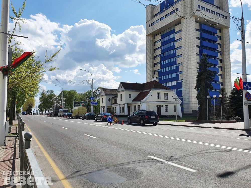 В четверг 7 мая в Бресте обновляли дорожную разметку на главных улицах. Корреспондент «БГ» застала работников дорожных служб в этот день на улице Ленина и на проспекте Машерова.