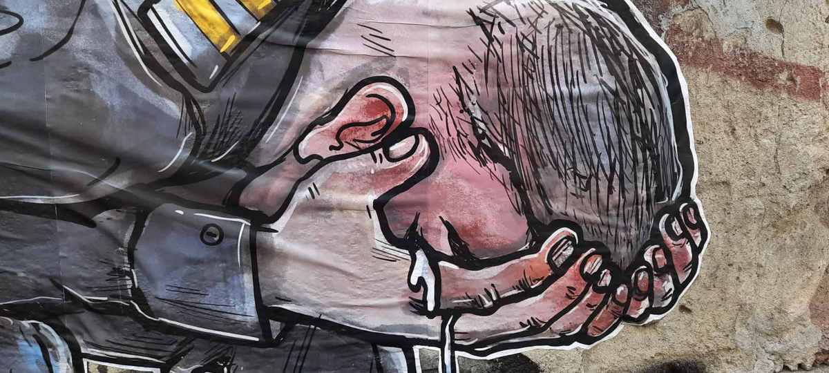 На стене в центре Бреста утром 4 июня брестчане заметили свеженький стрит-арт, связанный с недавними событиями в Гродно. Мы узнали, где это, и тоже сделали фото. Неизвестный художник изобразил милиционера, сидящего на лавочке, который плачет и думает об Оскаре.