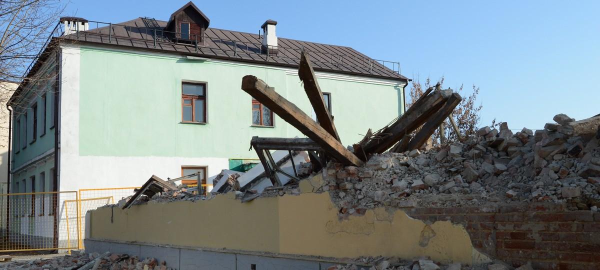 А вот целые стройматериалы — кирпичи и доски, которые останутся от снесенных на этом участке зданий, по словам рабочих, отдадут патриотическому центру.