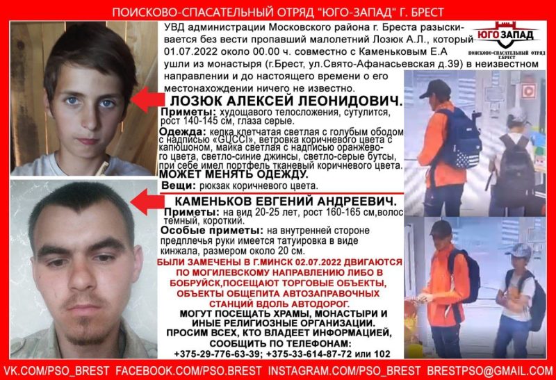 В Бресте пропал без вести 13-летний Алексей Лозюк. По данным МВД, 1 июля 23-летний житель Бобруйска Евгений Каменьков ушел вместе с подростком из монастыря «Афанасия» на улице Свято-Афанасьевской в Бресте в неизвестном направлении. Наружная камера видеонаблюдения запечатлела мужчину и несовершеннолетнего на одной из улиц города. Пропавшие были замечены в Минске. Предположительно, они двигаются по Могилевскому направлению либо в город Бобруйск.