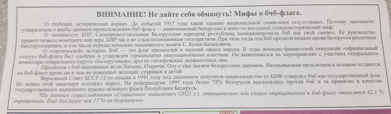 Правда, брестчанам, информация подается в укороченном формате. Первая часть «Мифы о БЧБ-флаге» совпадает слово в слово. Там говорится, в частности, о том, что «БЧБ-флаг — флаг предателей и палачей своего народа», а также, что «предатели с БЧБ-нашивками жгли Хатынь, Озаричи, Олу и еще тысячи белорусских деревень».