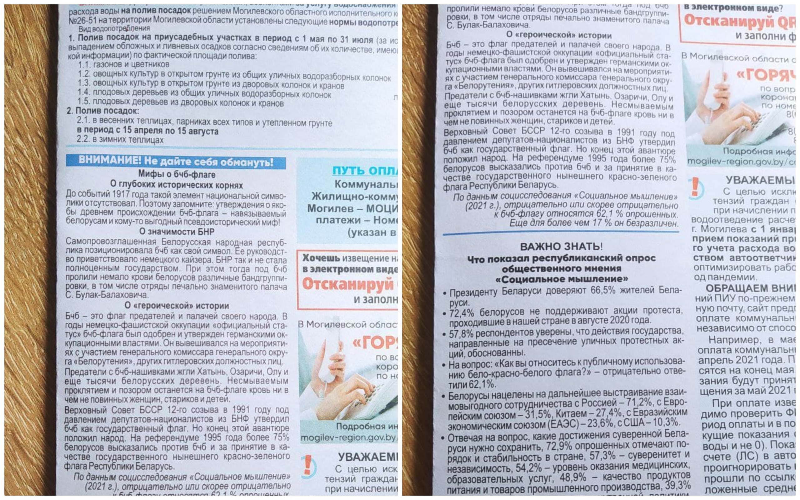 В минских и могилевских жировках в этом блоке также размещалась информация о рейтинге доверия Александру Лукашенко, проценте жителей страны, которые не поддерживают августовские акции протеста, достижениям суверенной Беларуси, справочная информация о социсследовании.