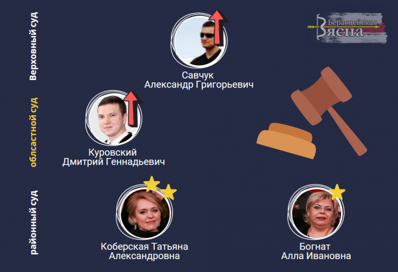 Например, Александр Савчук из судьи Брестского областного суда повышен до судьи Верховного суда. В качестве судьи облсуда Савчук занимался в том числе рассмотрением обжалований постановлений по ч.2 ст.19.11 КоАП (Распространение экстремистских материалов). Также Савчук в составе коллегии судей оставил без изменений приговор журналисту Сергею Гордиевичу (напомним, ему дали полтора года колонии).