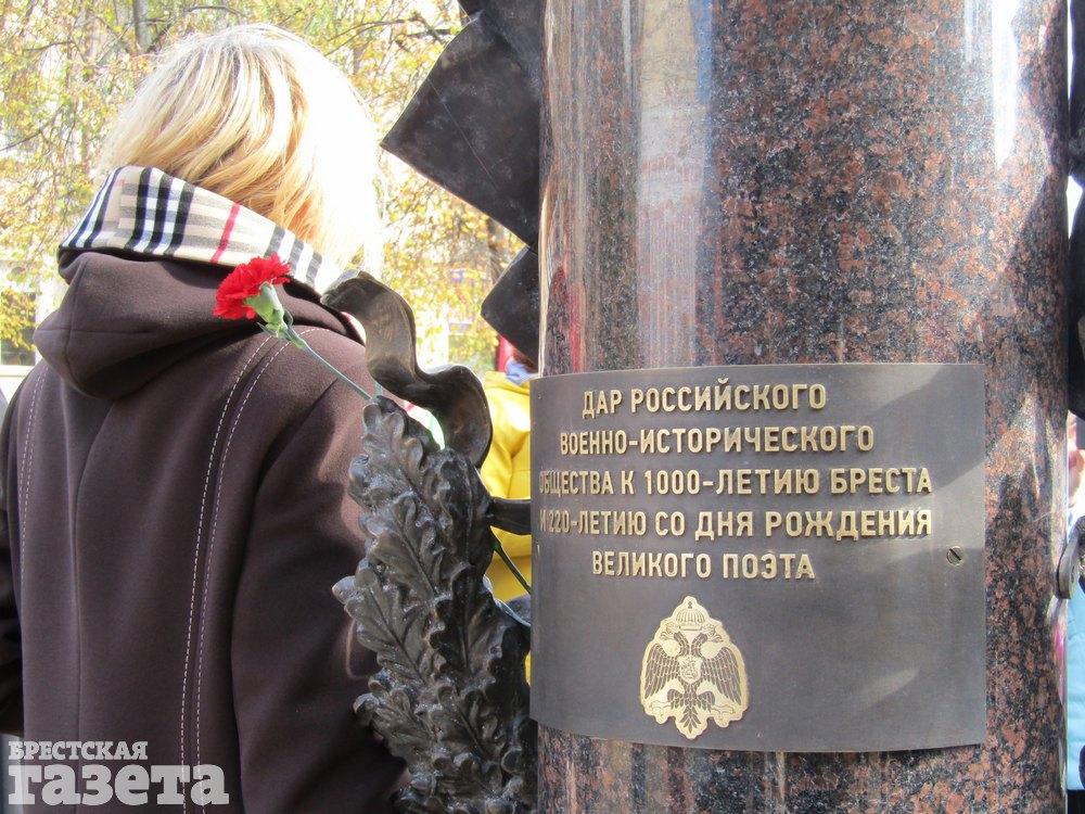 Идея появления этого памятника, который торжественно открыли 11 октября, родилась в посольстве Российской Федерации в Республике Беларусь, рассказал во время торжественной церемонии заместитель министра культуры РФ Николай Овсиенко. Это подарок 1000-летнему Бресту от российского военно-исторического общества.