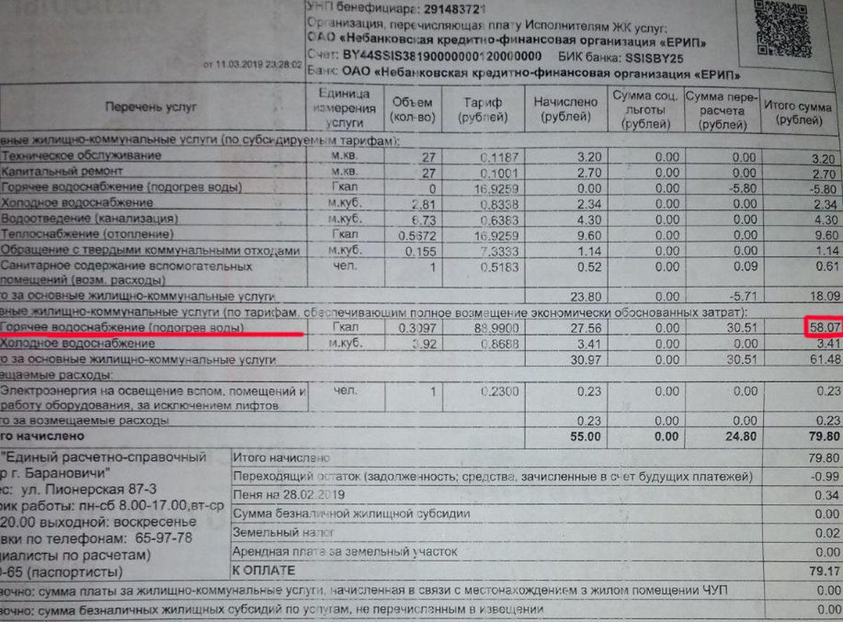 Жительница Барановичей Ирина сообщила, что плата за подогрев воды в мартовской жировке в их с мужем квартире выросла с 5,8 до 58 рублей. Женщина недоумевает, как получилась такая огромная сумма, ведь, по ее подсчетам, горячая вода для тунеядцев должна была подорожать не так сильно, пишет intex-press.by.
