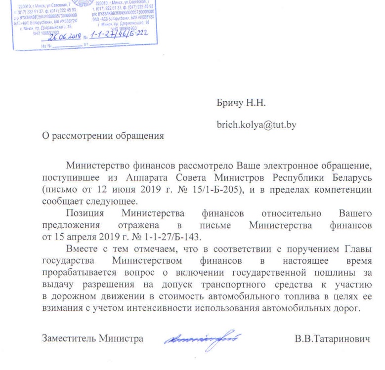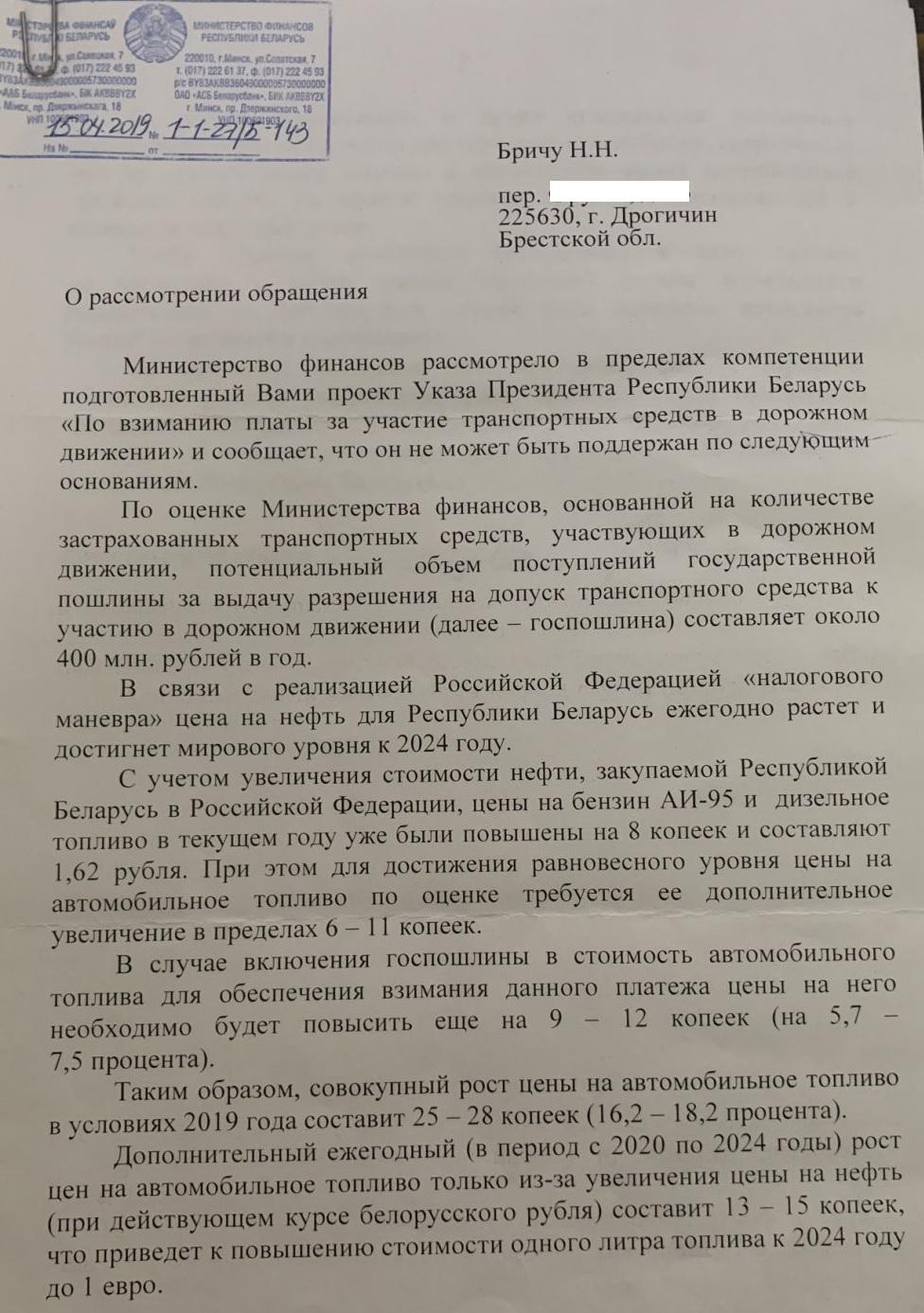 «Уважаемый Александр Григорьевич! Обратиться к Вам меня побудил и шокировал ответ Министерства финансов на мое предложение к проекту Указа Президента РБ по уплате транспортного сбора (налога, пошлины или плату за допуск к участию в дорожном движении), как его не назовешь. Суть одна.