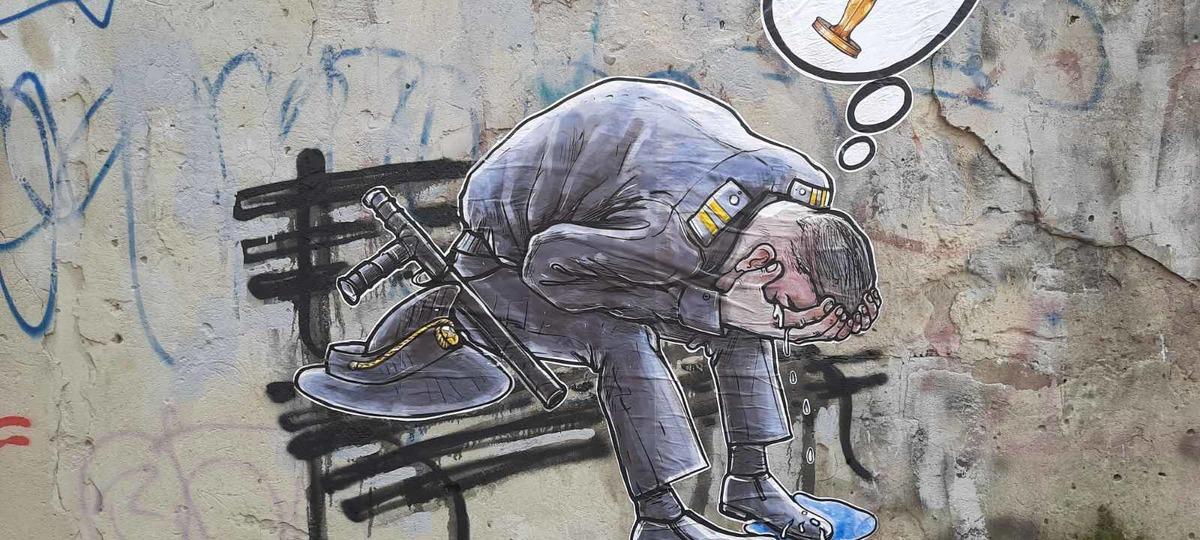 На нем неизвестный художник изобразил милиционера, сидящего на лавочке, который плачет и думает об Оскаре. Спустя несколько часов этот рисунок-наклейка был практически полностью содран со стены неизвестными. При этом содранные части наклейки не были убраны, а брошены на землю около этой стены. А еще стало понятно, что сначала художник нарисовал на стене лавочку, а потом наклеил плачущего милиционера.