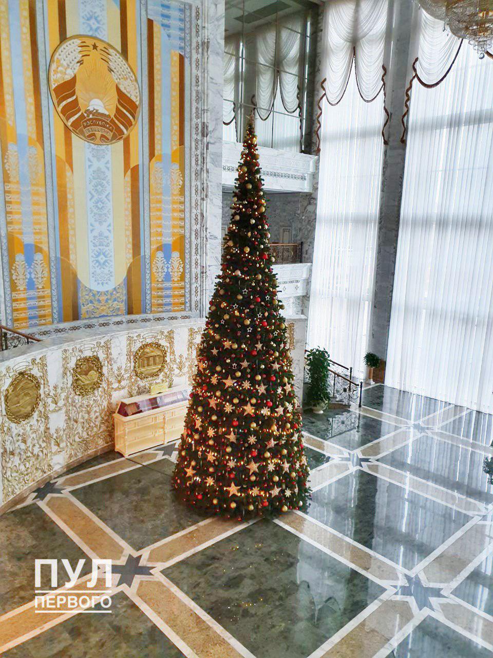 Телеграм-канал «Пул Первого» выложил фото елки, которая находится в рабочей резиденции президента Беларуси Александра Лукашенко — Дворце Независимости.