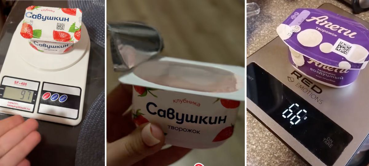 19 апреля в TikTok появилось видео, где гродненец жалуется на недовес творожной пасты «Апети Пломбир» от «Савушкина продукта». В кадре — полупустая баночка, а на весах — всего 76 граммов при заявленных 100. Автор утверждает: «Открыли — усомнились. Проверили запечатанную — там и вовсе 66 грамм».