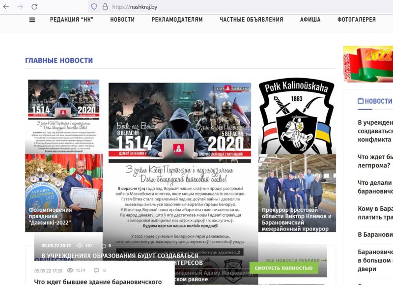 Беларуские хакеры взломали сайт барановичской газеты «Наш край», где разместили поздравление «З Днём КіберПартызан і надыходзячым Днём беларускай вайсковай славы». Никаких требований группировка не выдвигала, зато поблагодарила главреда «за суперсложные пароли» и напомнила, что «диктатура погибает, а голос народа пробивается даже через тиранию и жестокость».