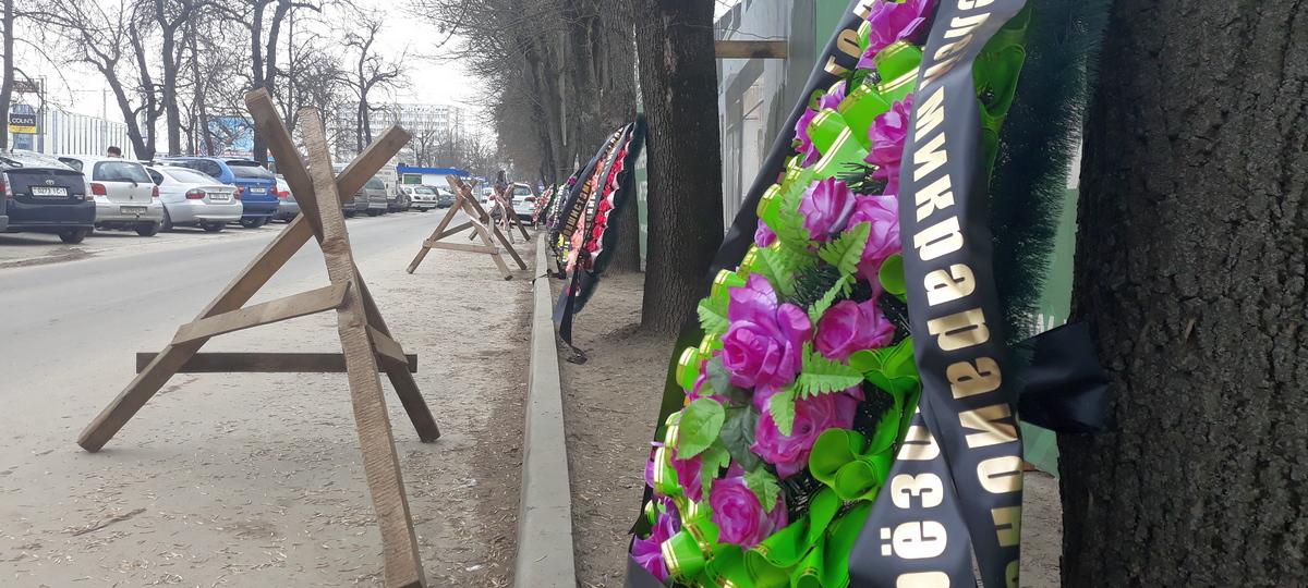 Брестский активист Виталий Казак 24 февраля принес к забору стройплощадки, на территории которой обнаружены останки сотен погибших людей, 11 венков с траурными лентами и лампадку.