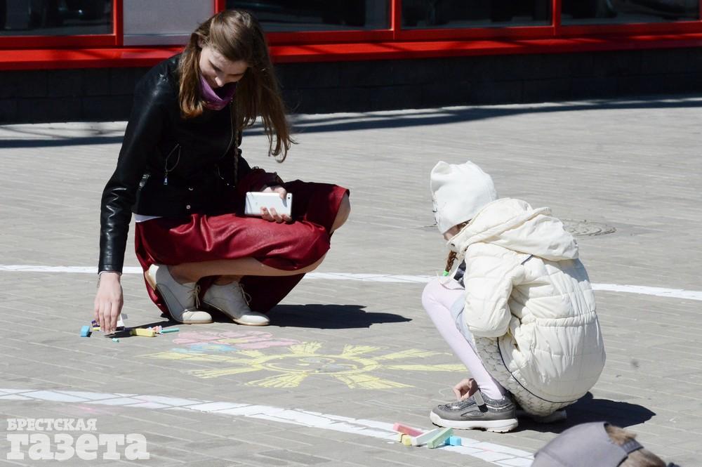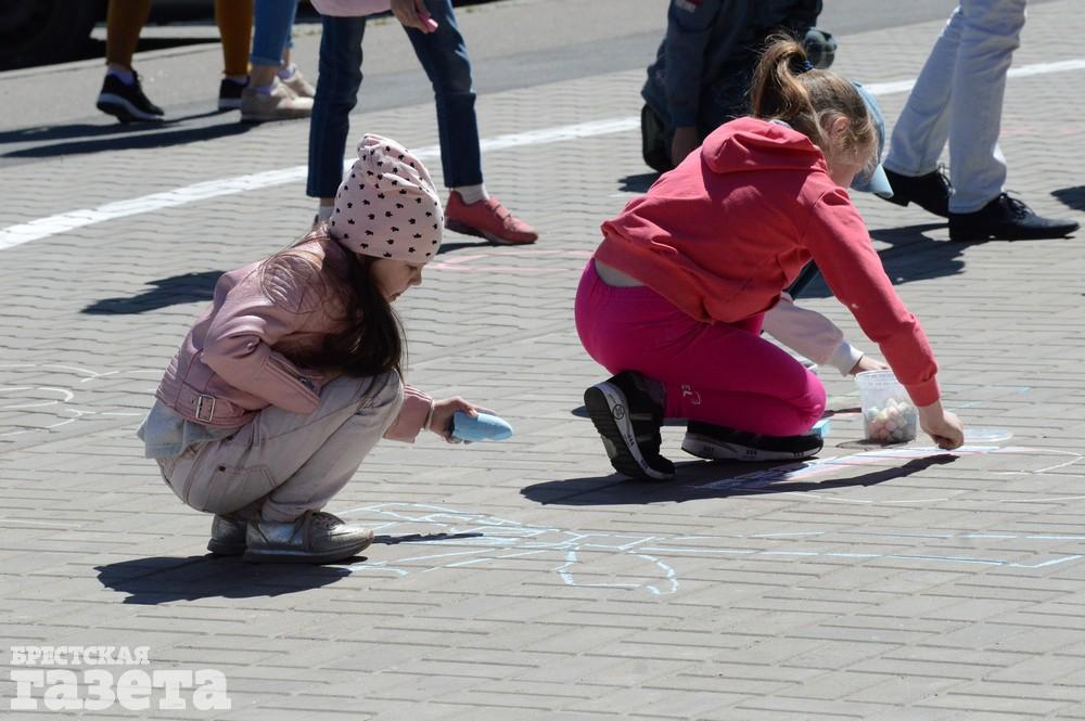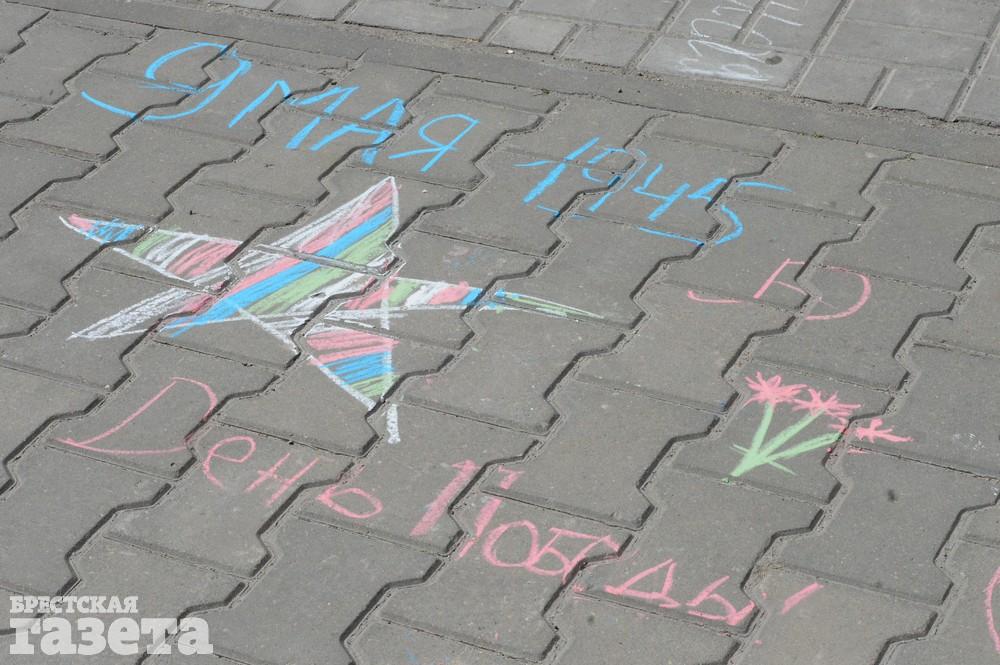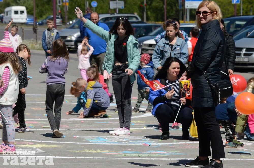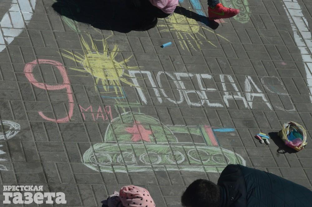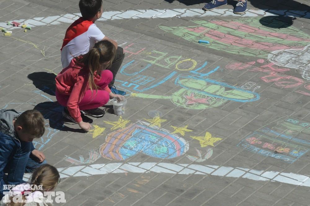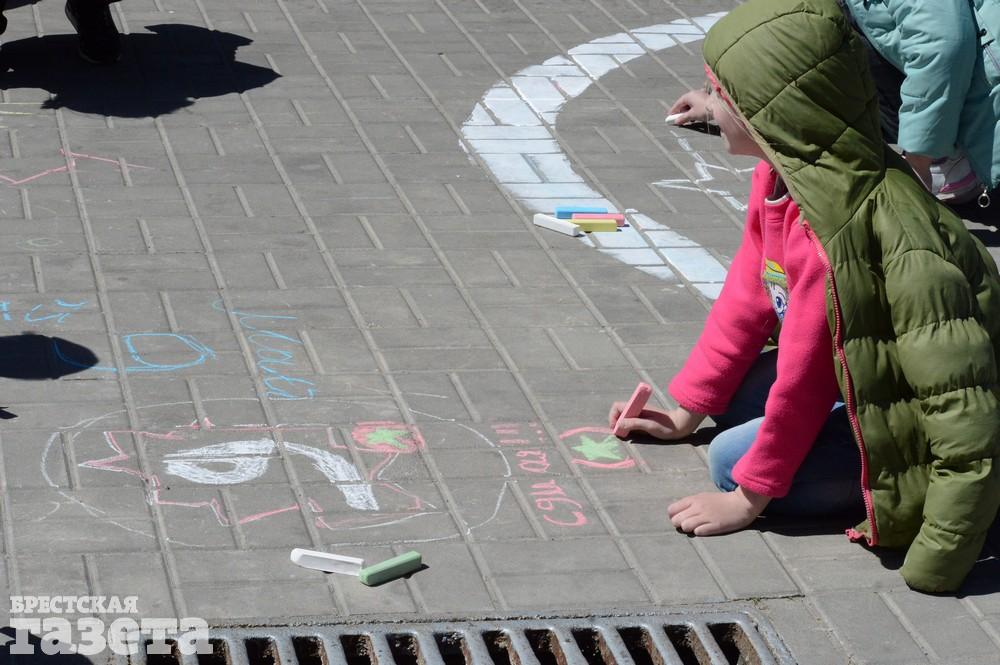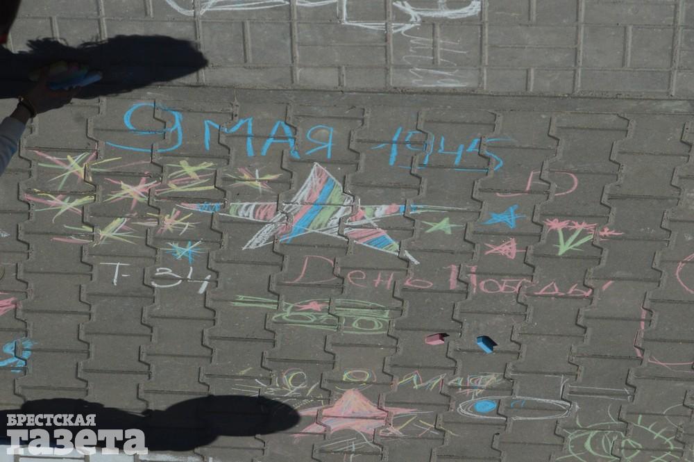 Дети рисовали мелками на тротуаре в центре большой девятки. Кто-то изображал танки, кто-то Брестскую крепость. Другие рисовали цветы и мирное небо, солнце. Участники флешмоба получали сладкие призы за свое творчество, фотографировались и бегали на площадке перед торговым центром под военную музыку.