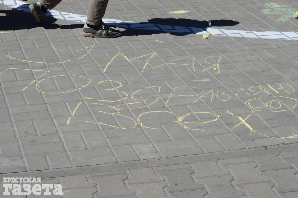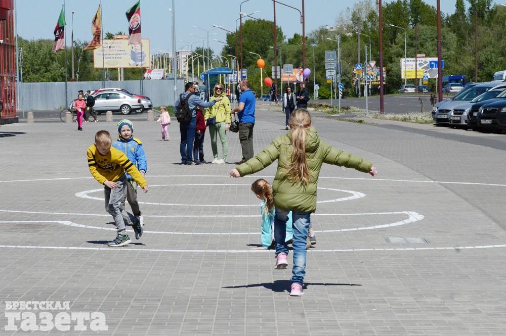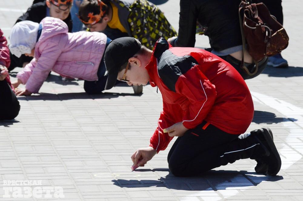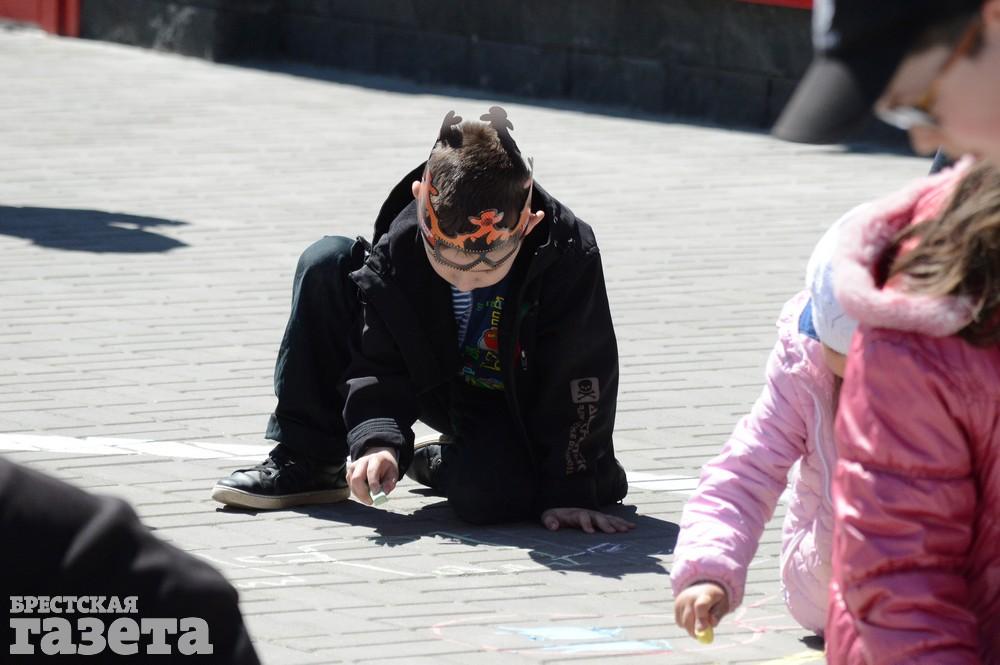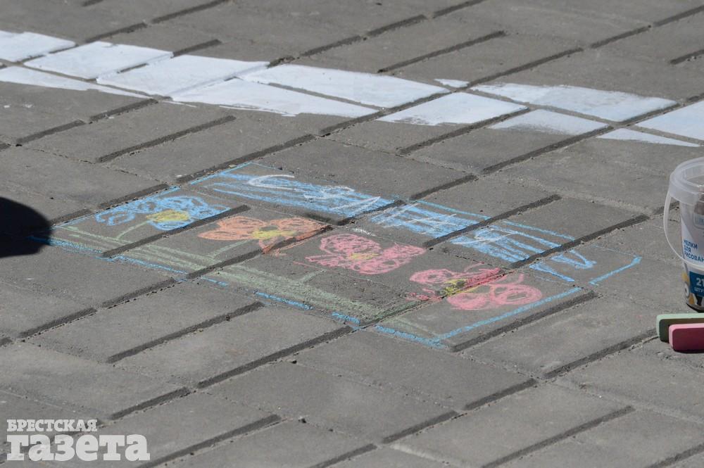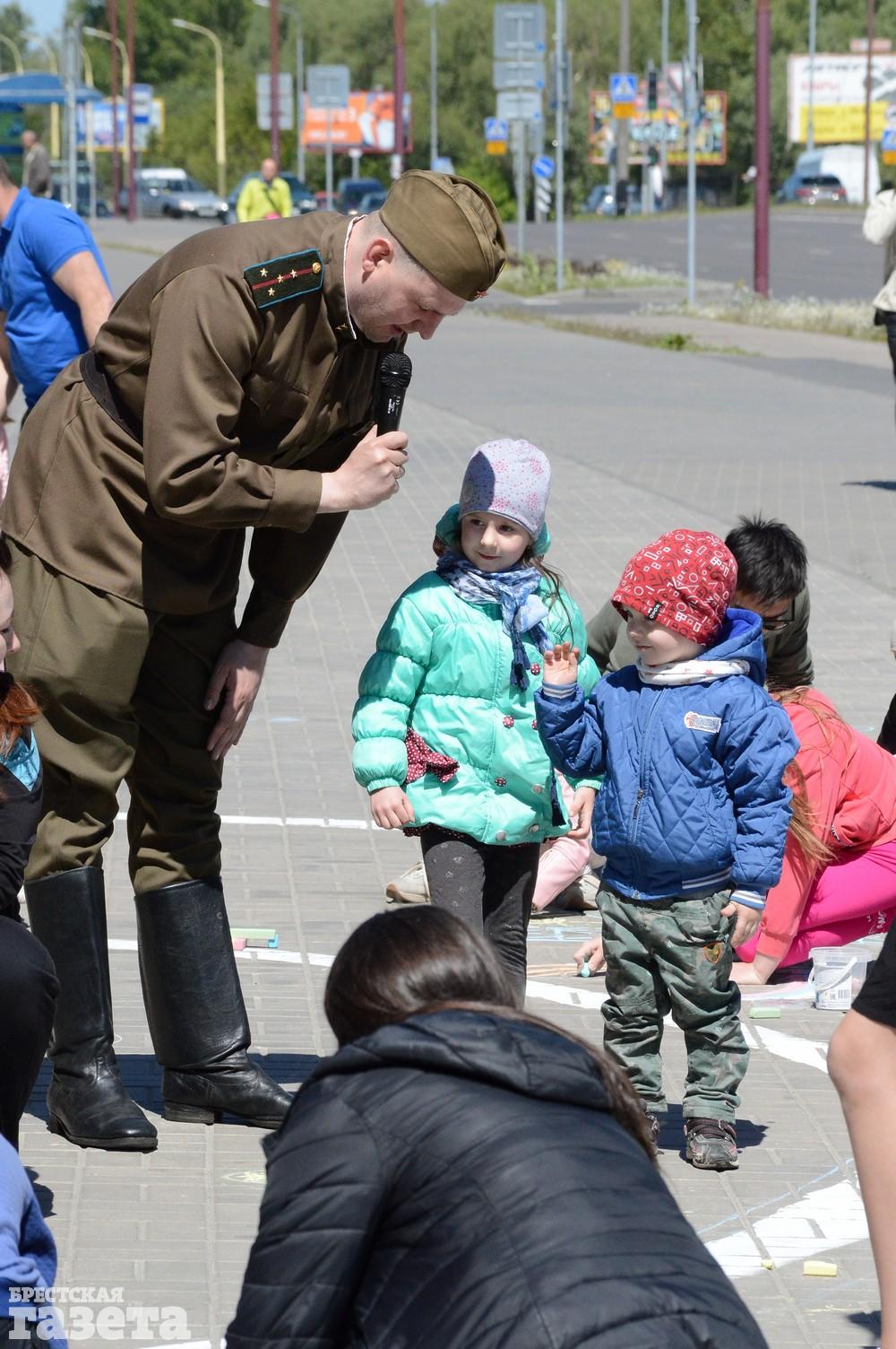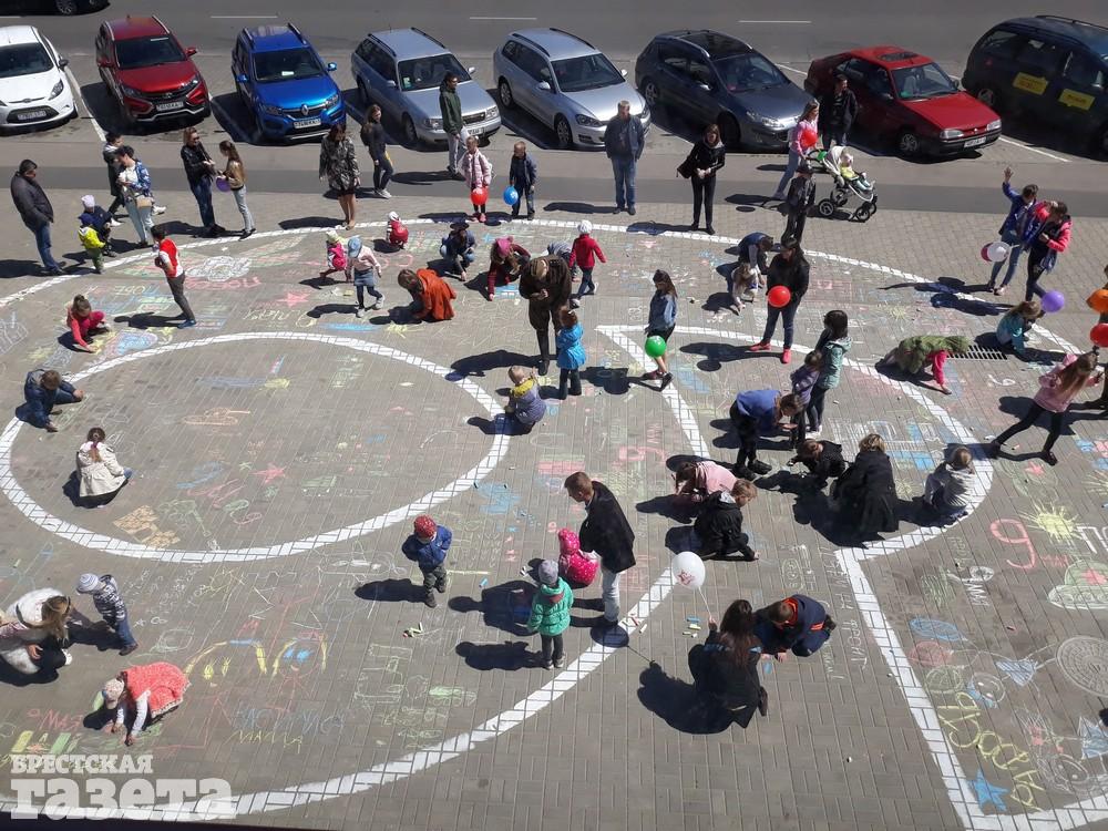 Дети рисовали мелками на тротуаре в центре большой девятки. Кто-то изображал танки, кто-то Брестскую крепость. Другие рисовали цветы и мирное небо, солнце. Участники флешмоба получали сладкие призы за свое творчество, фотографировались и бегали на площадке перед торговым центром под военную музыку.