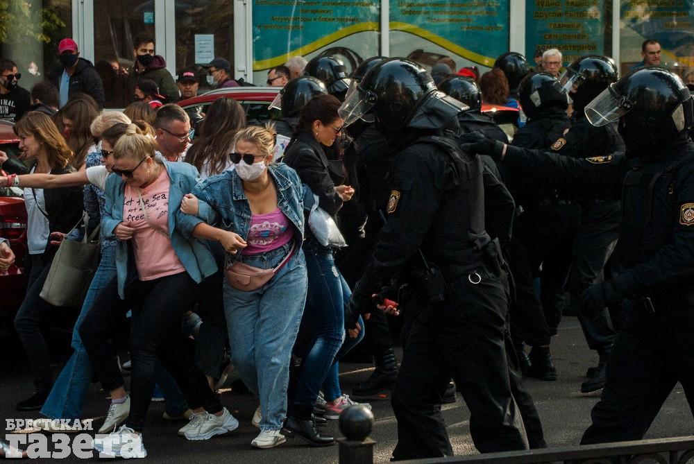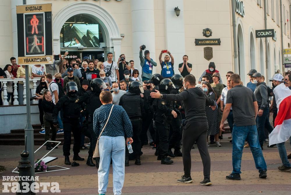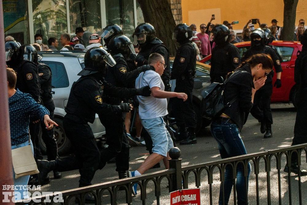 Если в прошлое воскресенье протестующих в Бресте разгоняли водометом, то сегодня распыляли в лицо газ. Как пояснили в МВД, «для пресечения противоправных действий протестующих».