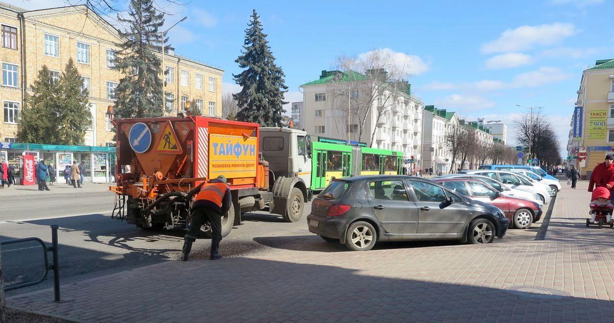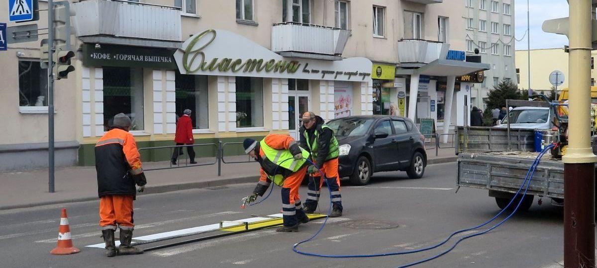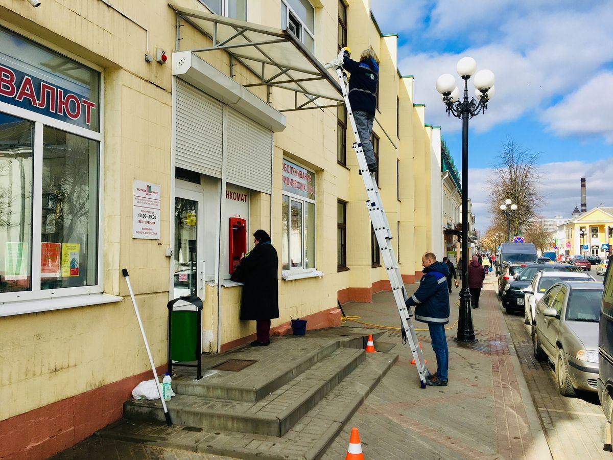 Днем 20 марта активнее всего велись работы в центре города. На дороги наносили новую дорожную разметку, красили столбы и заборы, мыли окна и козырьки зданий.
