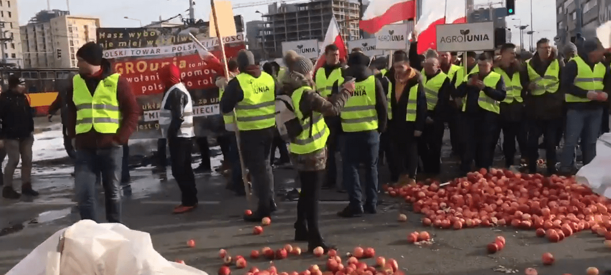 О том, что в Польше начался протест фермеров, сообщает sputnik.by. Несколько десятков представителей организации работников сельского хозяйства «Агроуния» собрались 13 марта на площади Завиши недалеко от центрального ж/д вокзала Варшавы. Фермеры рассыпали на проезжей части яблоки и подожгли покрышки, таким образом блокируя движение трамваев.