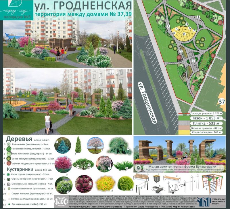 «Это место будет привлекать как жильцов рядом расположенных домов, так и работников предприятия. В обеденный перерыв сюда можно заглянуть, чтобы уютно расположиться на лавочках-буквах, которые так же являются теневыми навесами, и любоваться разнообразными растениями», — пишет Рогачук.