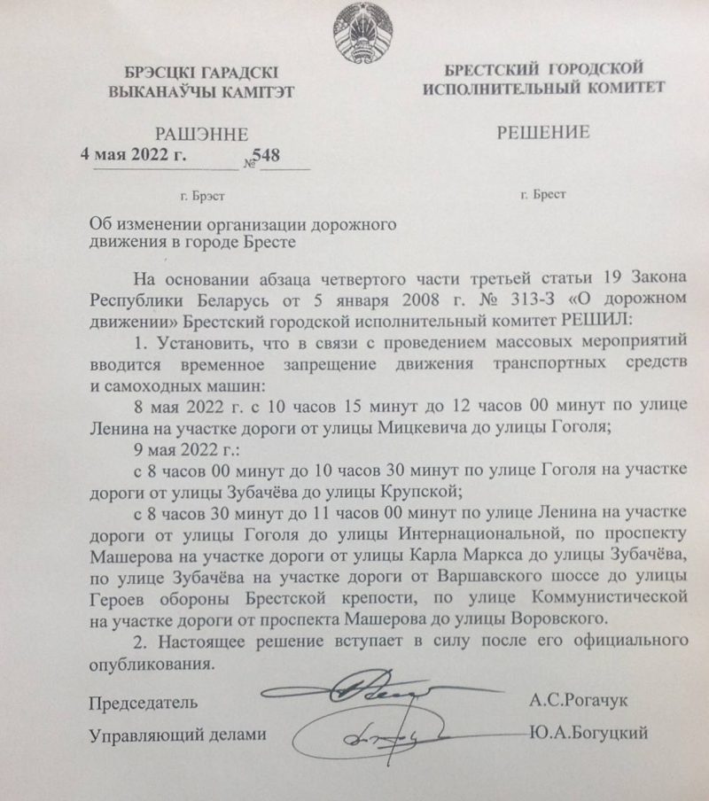8 мая с 10.15 д 12.00 на улице Ленина будет закрыт участок от улицы Мицкевича до улицы Гоголя. Об этом сообщил Александр Рогачук.