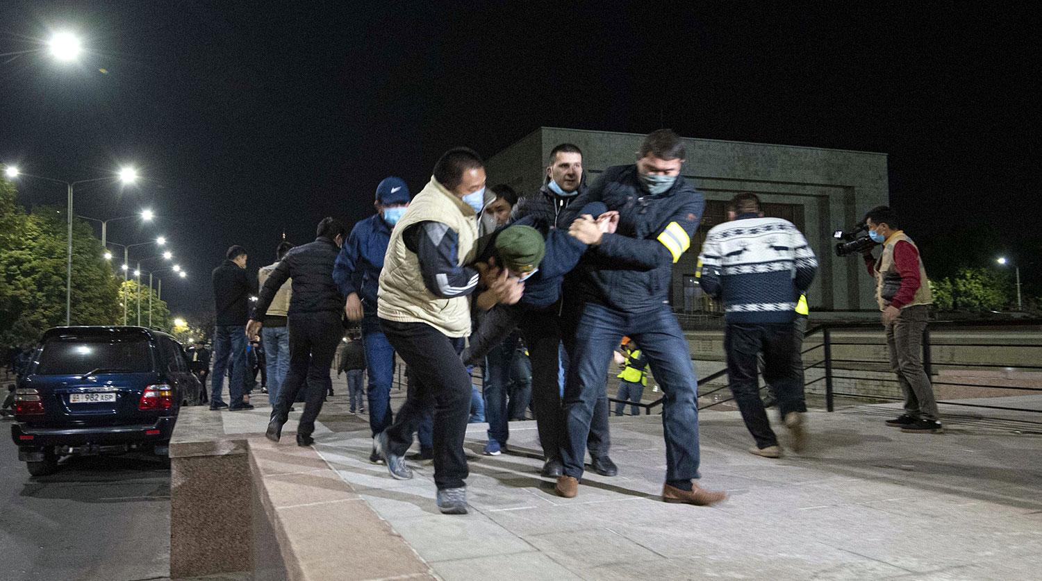 В результате беспорядков 5 октября в Бишкеке, по данным министерства здравоохранения страны, был госпитализирован 131 человек, среди них — 40 сотрудников силовых структур. Киргизские СМИ сообщают, что среди них был ранен Жанар Акаев — пресс-секретарь президента и зампред Комитета по социальным вопросам, образованию, науке, культуре и здравоохранению. Он один из лидеров партии «Ата Мекен», не прошедшей в парламент на этих выборах и не признавшей их итоги. Днем в понедельник он выступил на митинге на площади Ала-Тоо.
