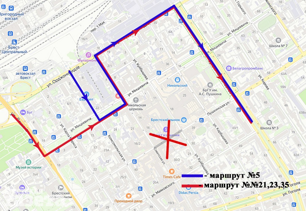 Как сообщает КТУП «Брестгортранс», на указанный период маршруты экспрессного сообщения №21; 23; 35 при движении от ул. Ленина будут следовать по ул. Мицкевича – ул. Советская – ул. Орджоникидзе – бульвар Космонавтов и далее по маршруту.