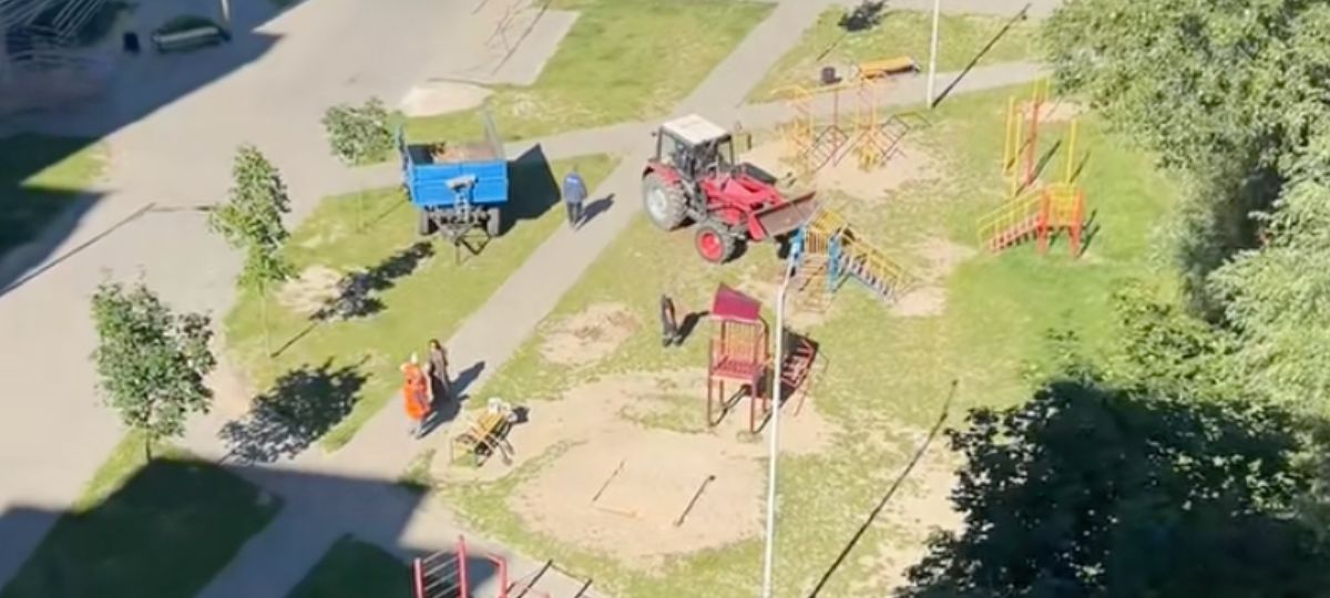 Пинчанин выложил в TikTok видео, где во дворе улицы Революционной, 3А работники ЖКХ демонтируют детскую площадку.