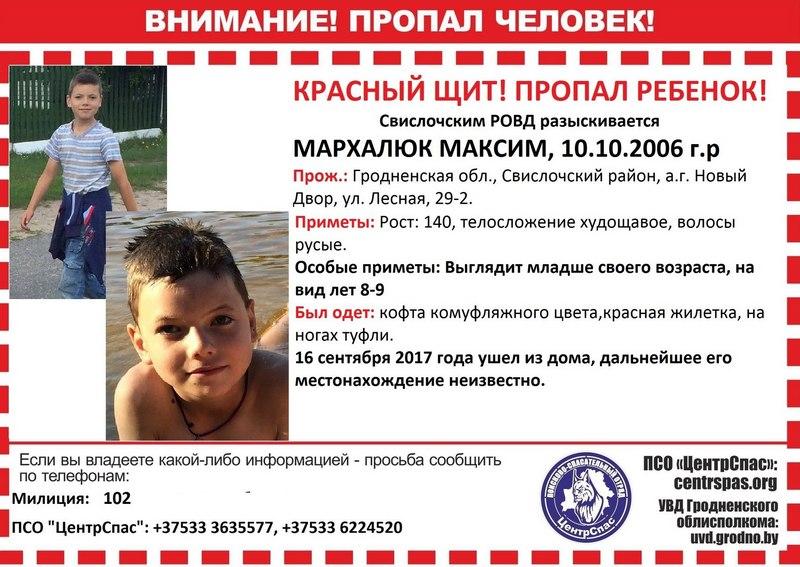 Напомним, 10-летний Максим Мархалюк из агрогородка Новый Двор Свислочского района Гродненской области ушел в лес за грибами вечером 16 сентября и не вернулся. Родственники стали искать его, но безрезультатно. В 22.13 родители сообщили в милицию. К сожалению, мальчик ушел в лес без мобильного телефона.