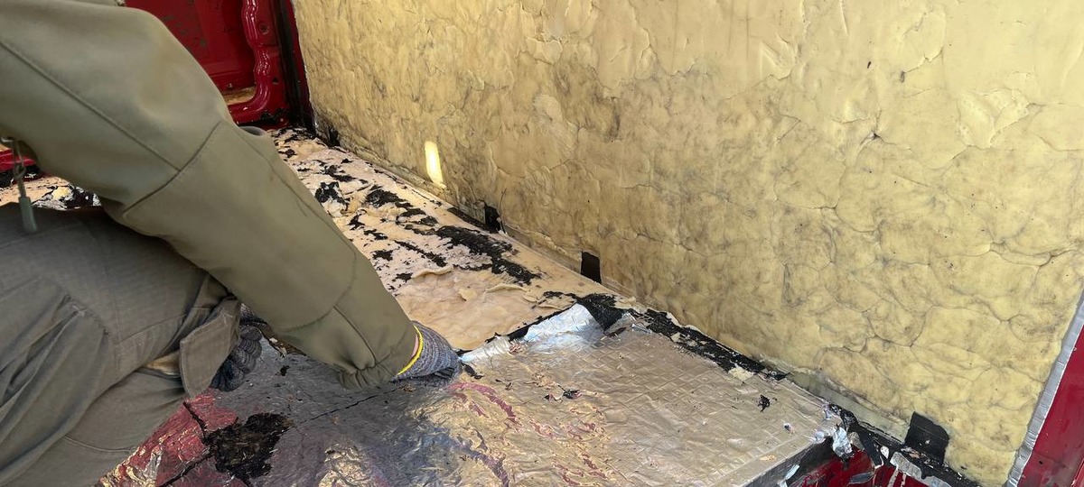 Во время углубленного досмотра автомобиля с применением специального оборудования обнаружили скрытые отсеки с веществом светло-серого и светло-желтого цвета. Материал, предположительно замаскированный с использованием звукоизоляционных панелей и обработанный технической смазкой, чтобы избежать обнаружения служебными собаками, был спрятан под полом и в перегородке между кабиной и грузовым отсеком.