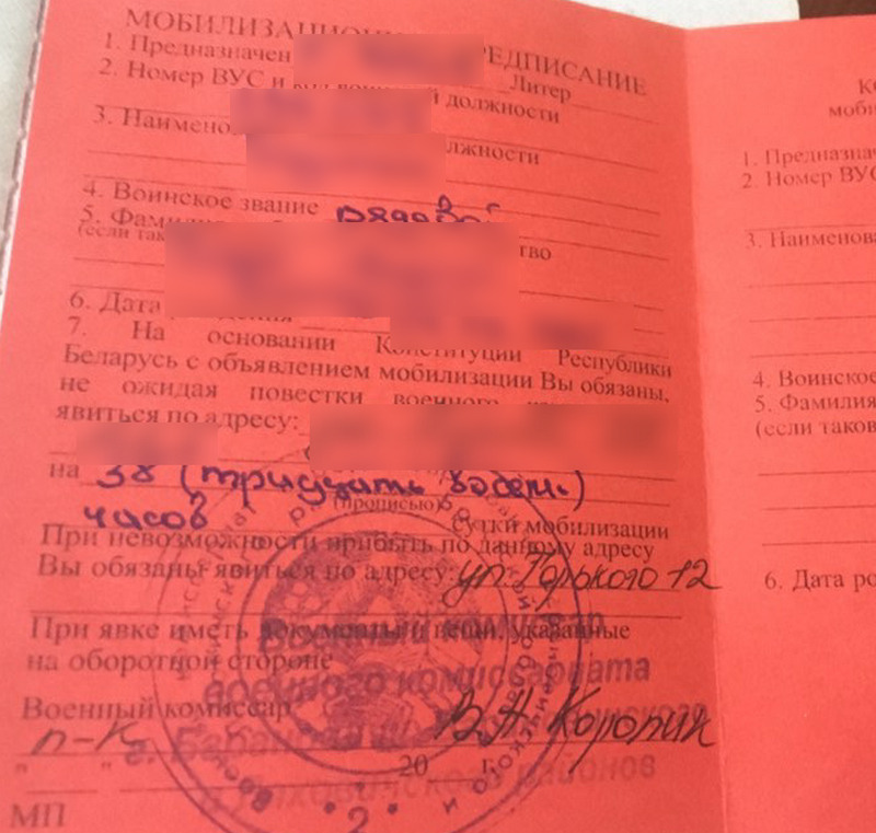 По словам мужчины, на учете в военкомате он состоит более 10 лет, но красную бумажку в военный билет ему вклеили впервые. В предписании, которое выдали мужчине, говорится, что в случае объявления мобилизации в стране он обязан будет в течение 38 часов, не дожидаясь повестки из военкомата, явиться с паспортом, воинским билетом, вещами и запасом еды на сутки на мобилизационный пункт по указанному в предписании адресу или в военкомат.